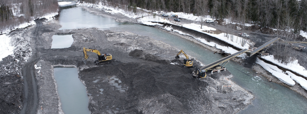 Twin Valley Contracting delivered a carefully engineered aggregate removal and river restoration project along the Illecillewaet River, addressing significant gravel build-up that had altered natural flow patterns and increased erosion risk. Work was completed across seven sections, with access routes constructed on both riverbanks and materials transported to designated burrow pits. The team used excavators, conveyors, loaders, and rock trucks to safely extract and relocate aggregate while keeping public pathways accessible.